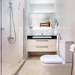 There are conveniences, like an iron and ironing board, and climate control, along with a flat-screen TV with satellite channels. Bathroom amenities comprise a separate toilet and a shower, as well as hair dryers and towels.